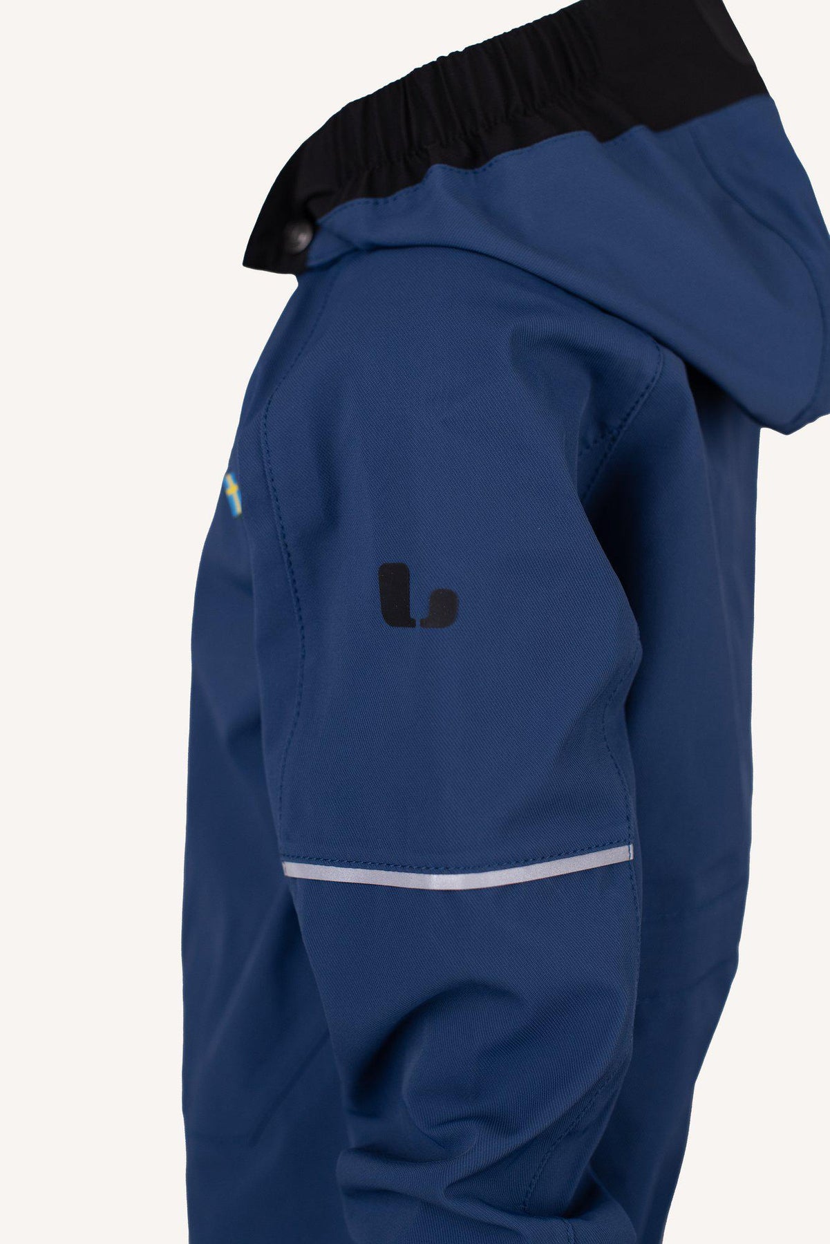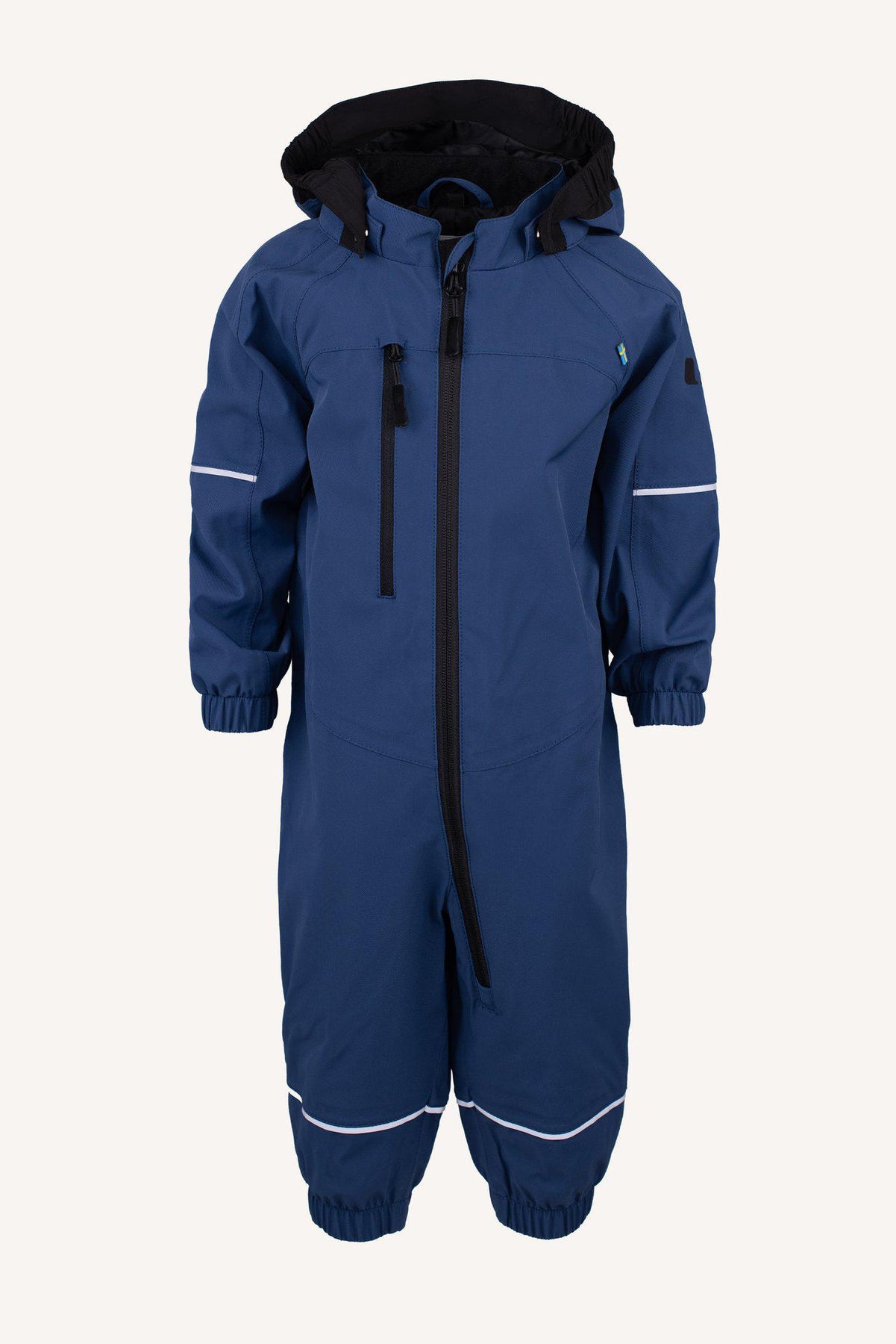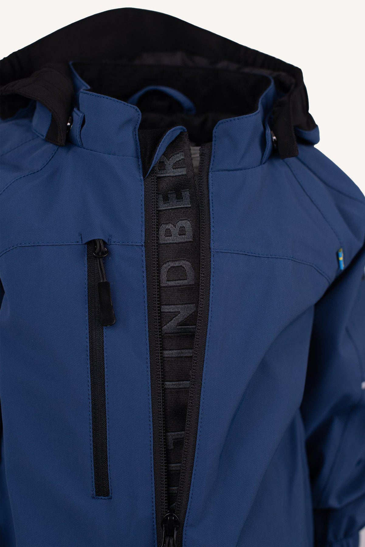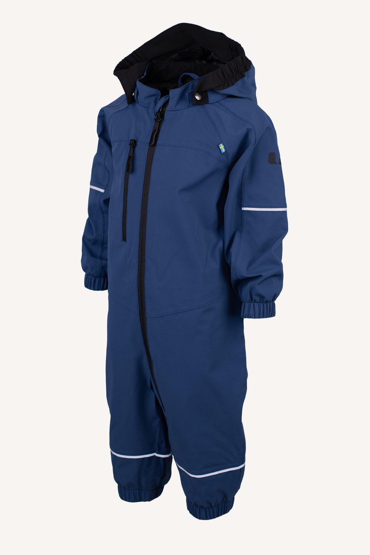 "Drammen" är vår mest funktionella skaloverall som skyddar mot både vind och vatten. Den har extra höga vattenpelare på 15000 mm, riktigt bra andningsförmåga och tejpade sömmar, allt för att klara olika väderlekar. Tyget är mjukt och stretchigt, med en lätt strukturerad yta som är enkel att torka av. Overallen har en justerbar midja, en lång frontdragkedja som gör det lätt att klä på barnet, avtagbar huva, nylonfoder, flera reflexdetaljer, resår i ben- och ärmslut och en bröstficka som öppnas/stängs med en dragkedja.