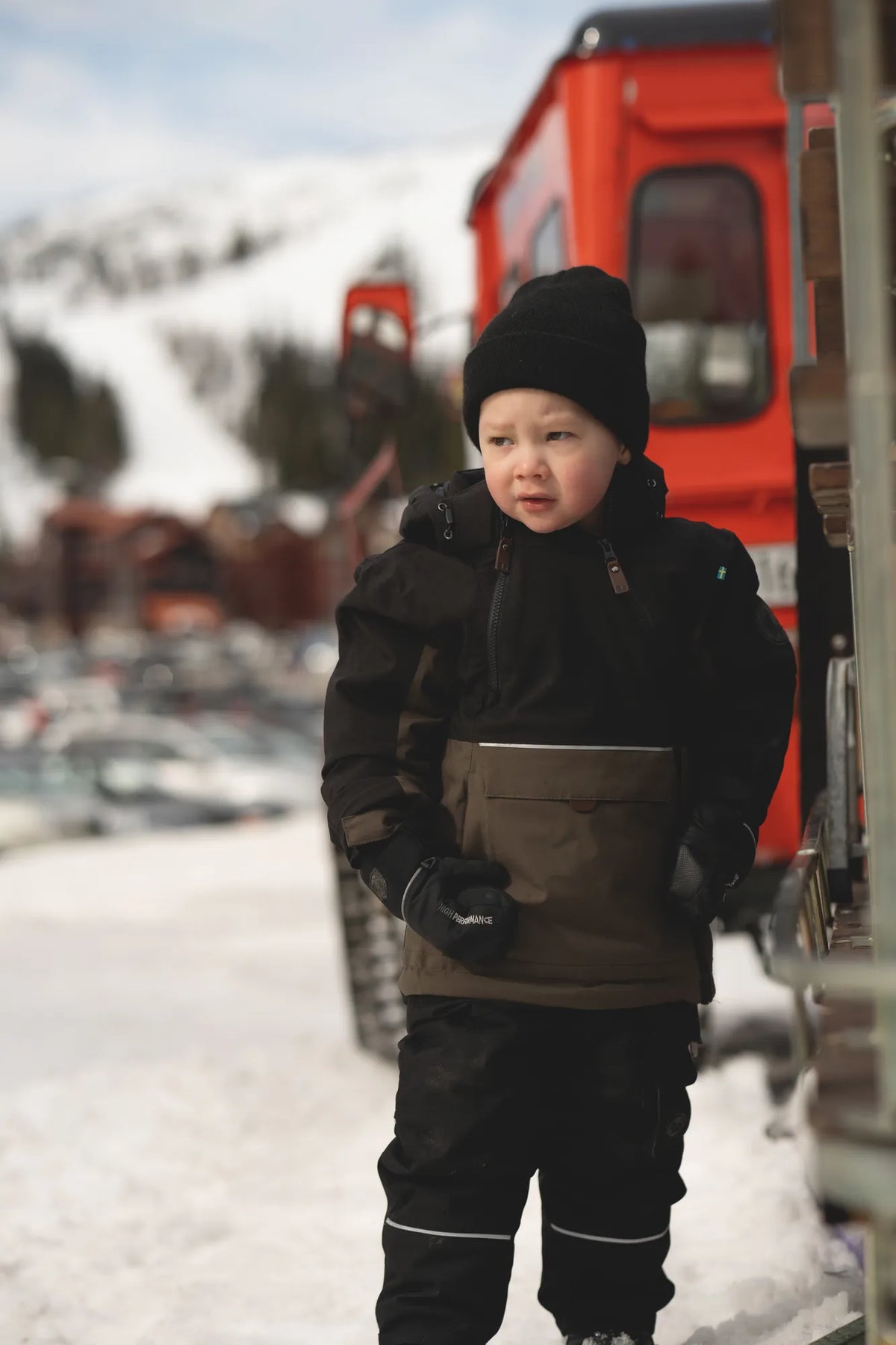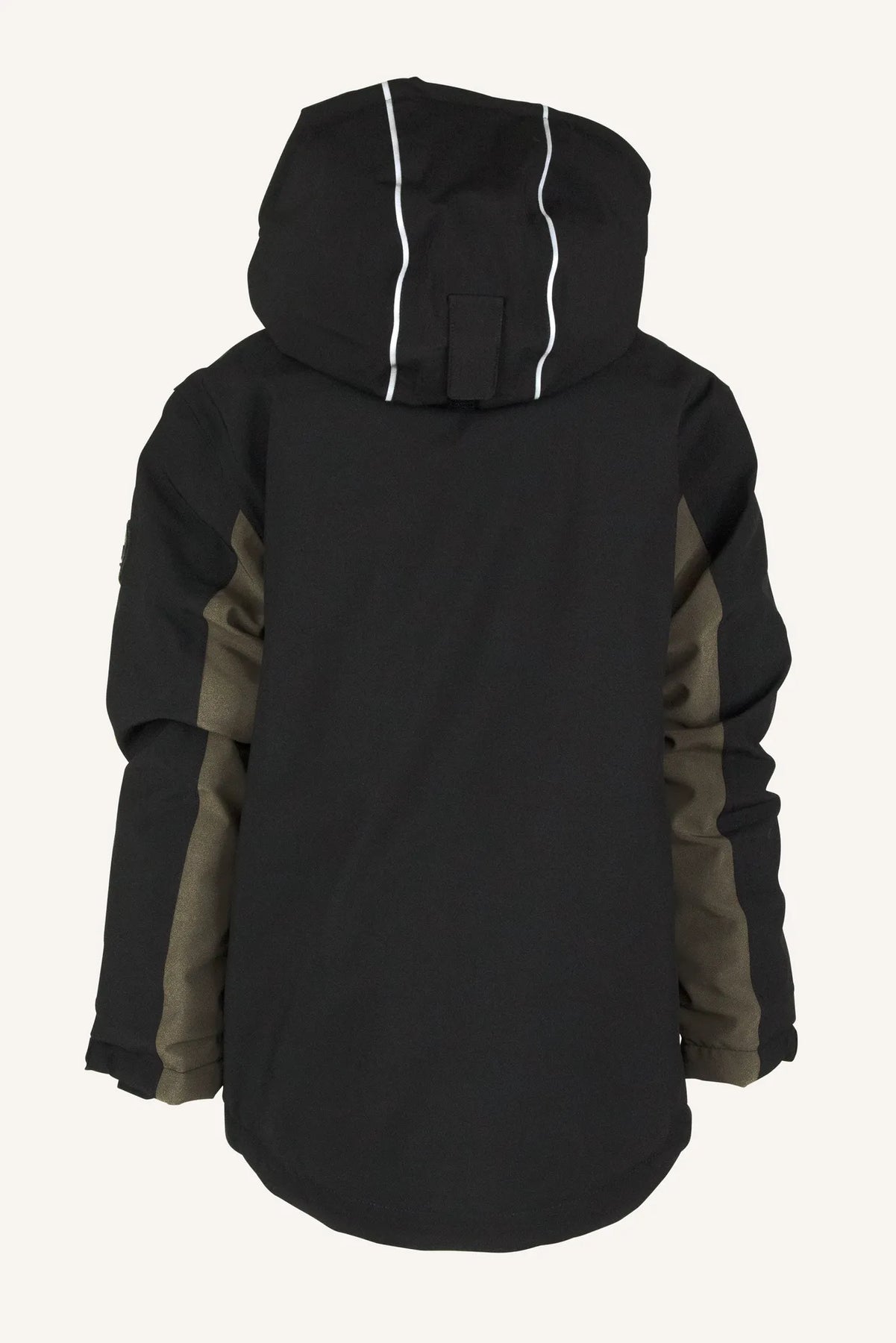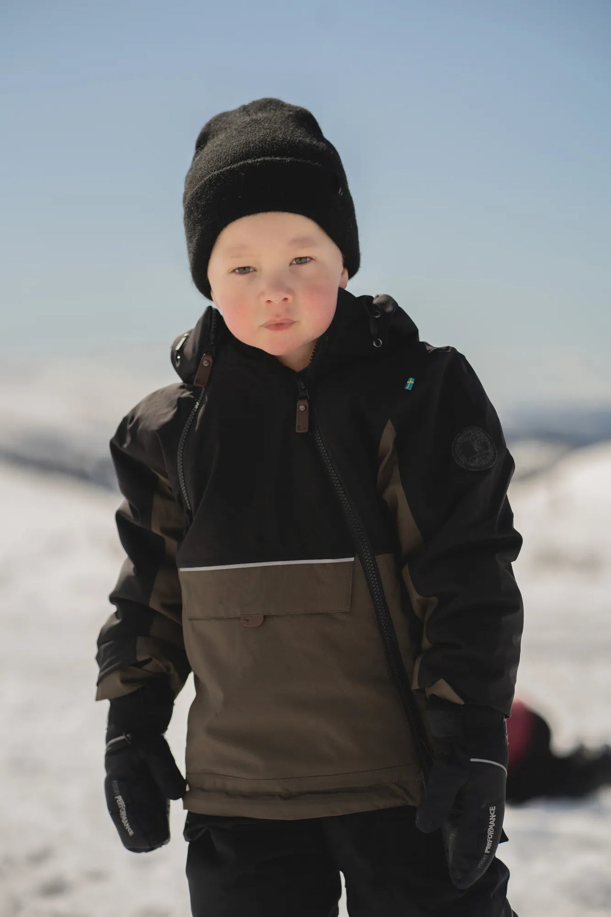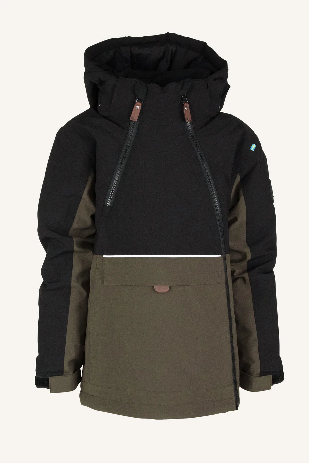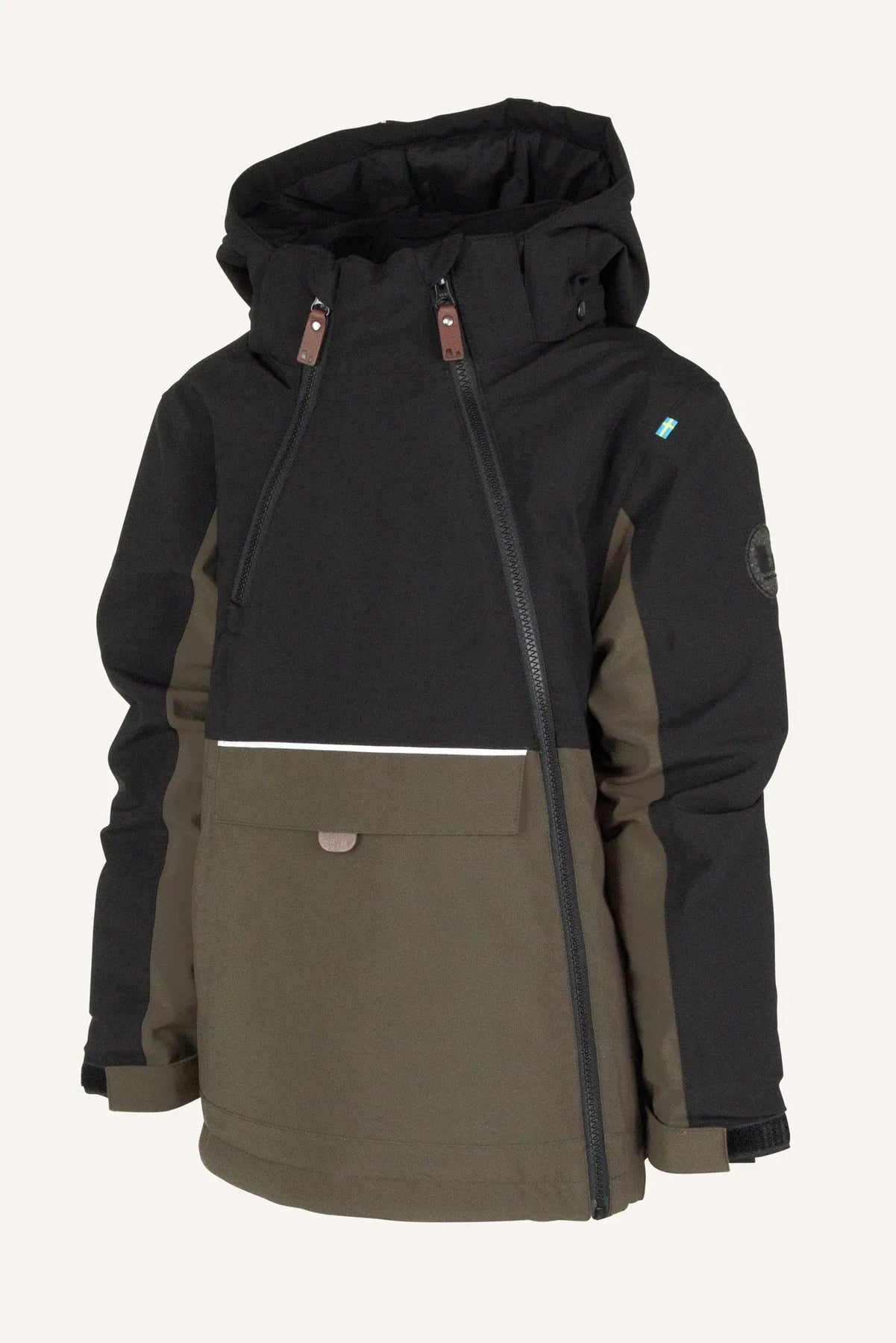 Anorak är en smidig vinterjacka, gjord i ett stretchigt och mjukt material med en värmande stoppning som gör att den klarar många minusgrader. Den har en hög vattentäthet och god andningsförmåga, vilket minimerar risken för att svett kyler ner ditt barn och du jobbar enkelt med lager-på-lager då jackan är fodrad i nylon. Ärmsluten är justerbara och har praktiska lycramuddar med tumhål samt "grow cuff", som gör att du kan förlänga ärmlängden genom att sprätta upp en söm på insidan. Jackan har också dragsko längst ner, en lång och en kort frontdragkedja, två i en-ficka på magen (där ena fickan öppnas/stängs med kardborre och andra med dragkedja) och reflexdetaljer. Huvan är justerbar och avtagbar.
