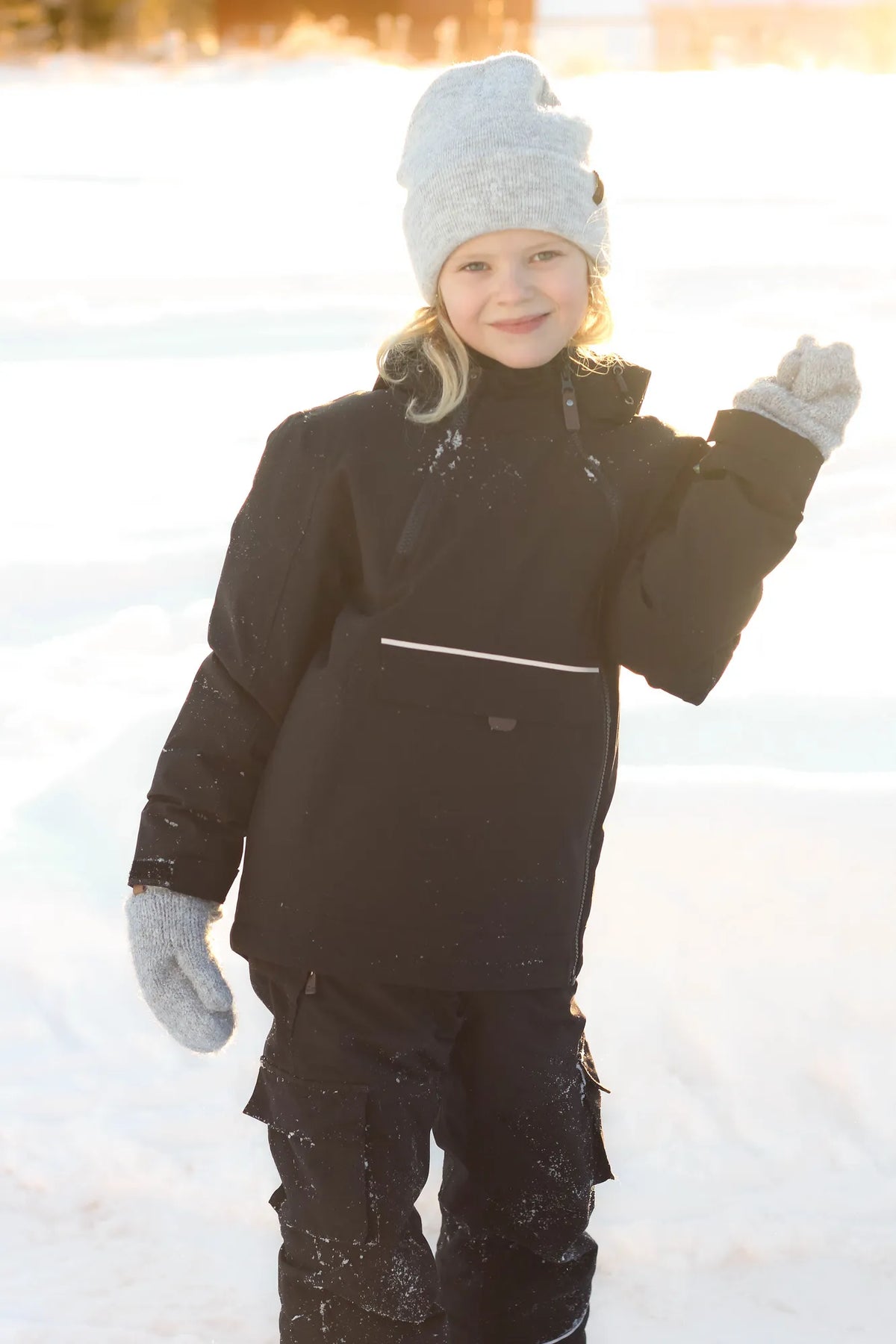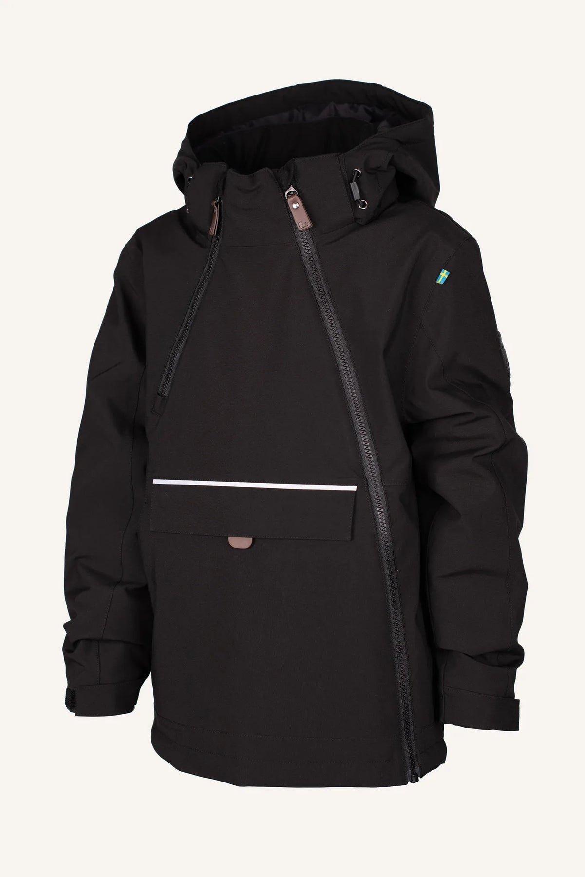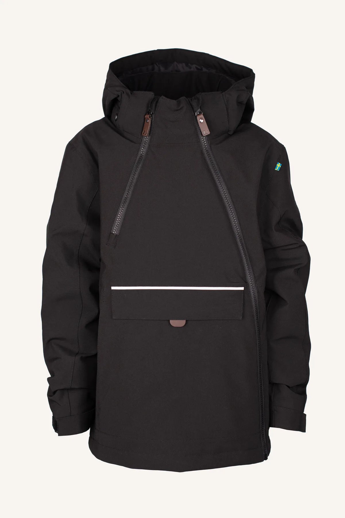 Anorak är en smidig vinterjacka, gjord i ett stretchigt och mjukt material med en värmande stoppning som gör att den klarar många minusgrader. Den har en hög vattentäthet och god andningsförmåga, vilket minimerar risken för att svett kyler ner ditt barn och du jobbar enkelt med lager-på-lager då jackan är fodrad i nylon. Ärmsluten är justerbara och har praktiska lycramuddar med tumhål samt "grow cuff", som gör att du kan förlänga ärmlängden genom att sprätta upp en söm på insidan. Jackan har också dragsko längst ner, en lång och en kort frontdragkedja, två i en-ficka på magen (där ena fickan öppnas/stängs med kardborre och andra med dragkedja) och reflexdetaljer. Huvan är justerbar och avtagbar.