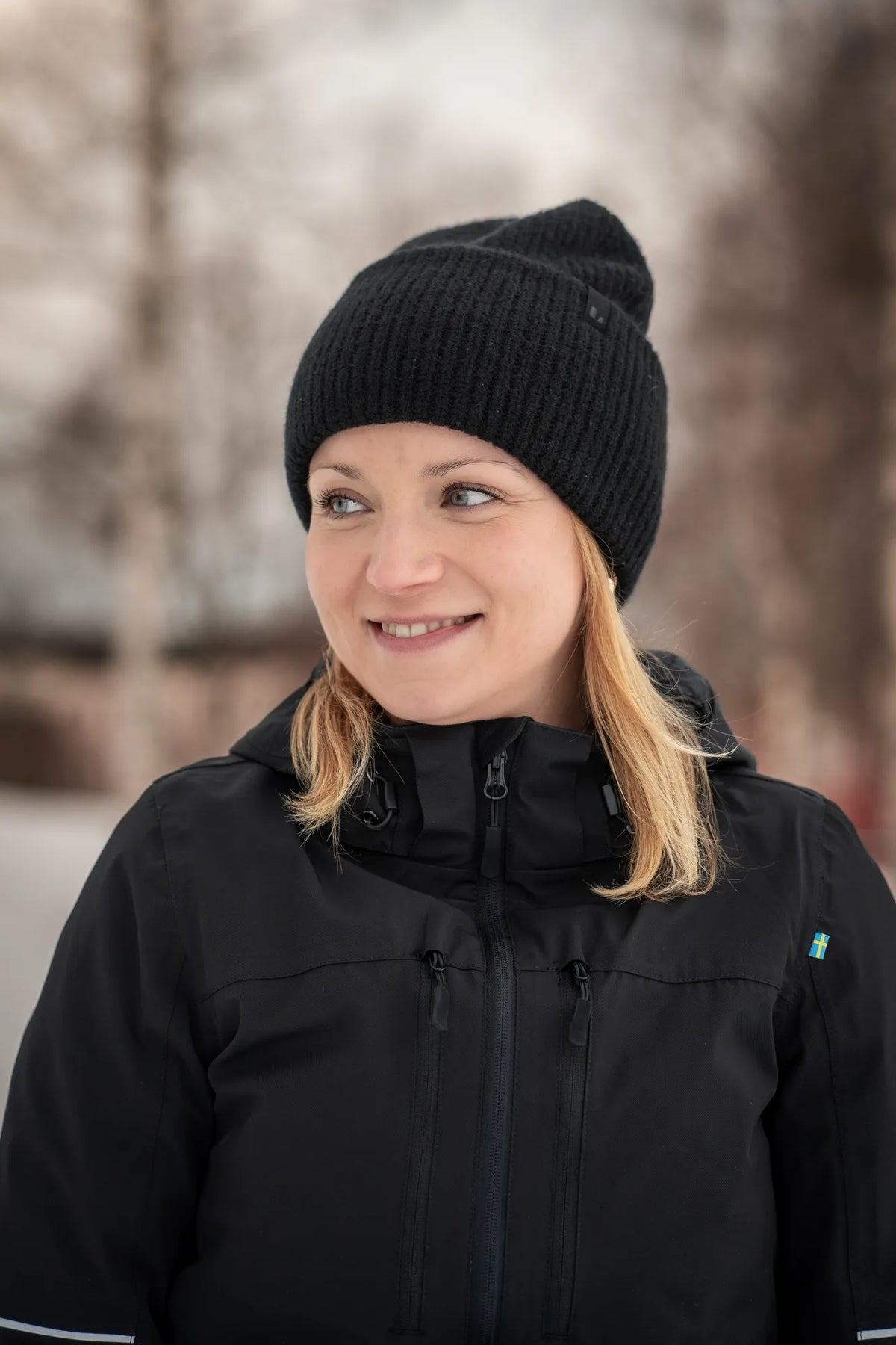 Mjuk och lätt mössa tillverkad i en mix av bland annat återvunnen polyester och ull. Passformen är lite lösare och sitter väldigt skönt på huvudet. Mössan har ett extra brett uppvik, är varm och elastisk.