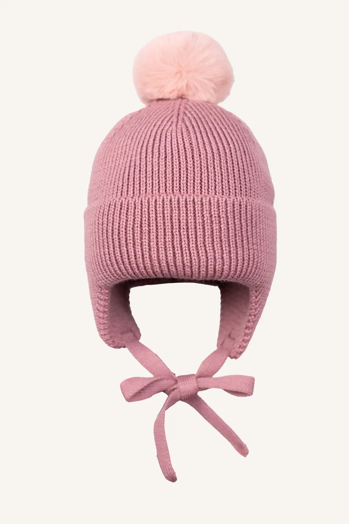 Roxy är en mjuk och skön vintermössa i ullblandning med en pompom på huvudet, knytband och värmande fleecefoder på insidan.