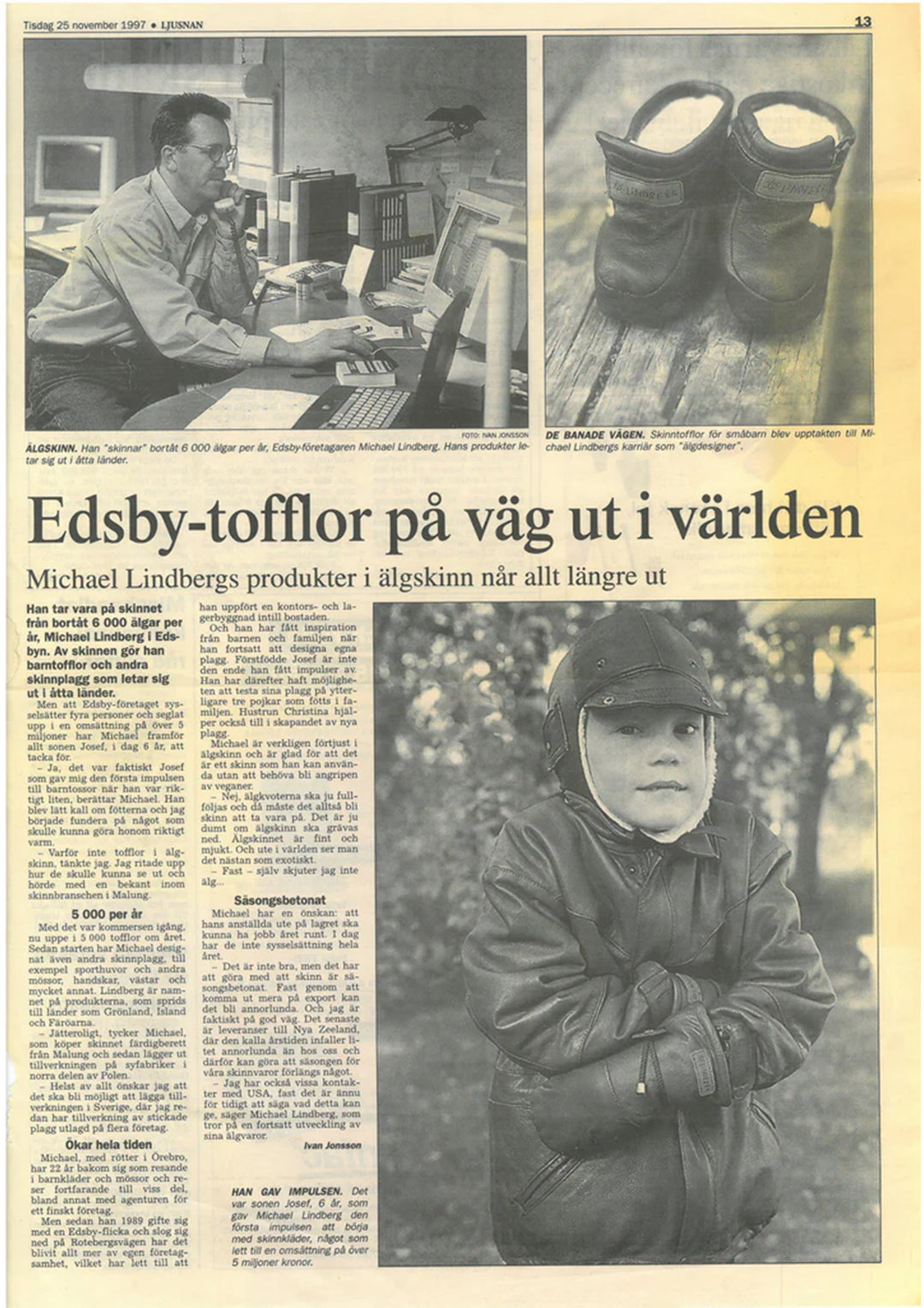 Although Michael Lindberg AB was registered in 1987, the Lindberg brand was born this year. The range of products in Scandinavian moose leather grew rapidly and soon Michael had booties, hats and gloves to offer. He had found a gap in the market where there were no products warm enough to warm children's frozen feet and it quickly spread among customers. Michael built a 170 square meter warehouse on the farm, where he could store his stock.