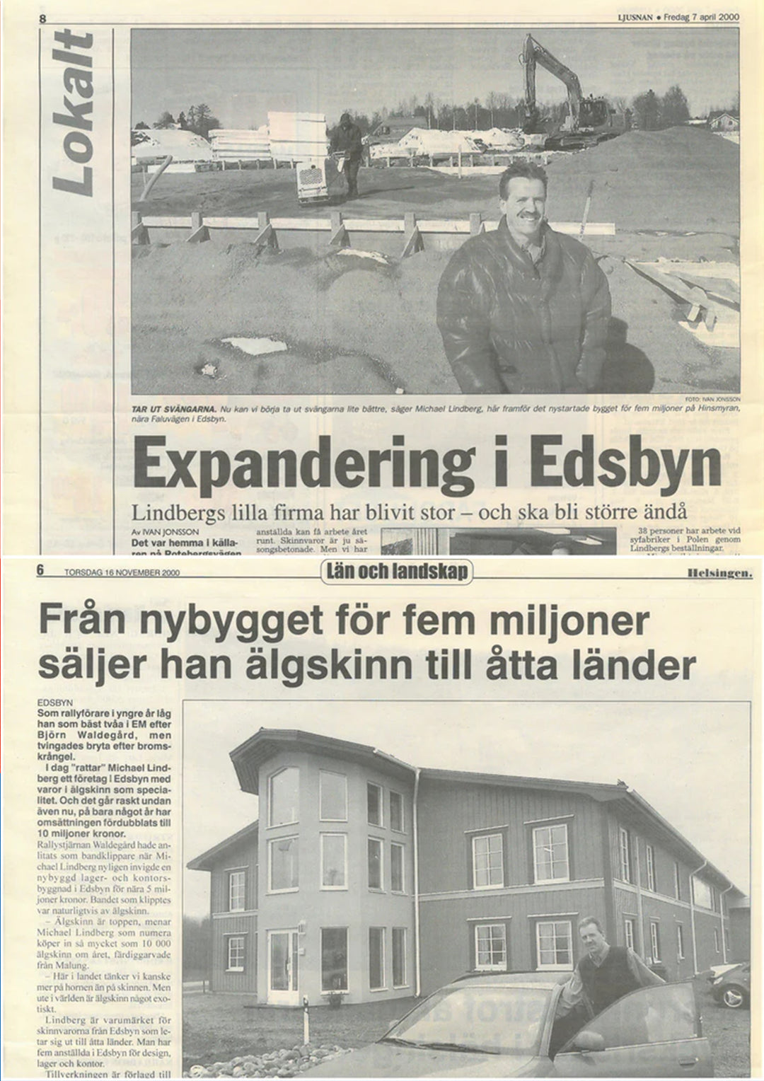 Lindberg now had 4 employees and continued to grow, so Michael decided to build a 600 square meter warehouse a few kilometers away from his current warehouse. He wanted to inaugurate the place in a special way and through a customer got in touch with Björn Waldergård - the world's first world rally champion, who took on the task of cutting the mooseskin ribbon. A memorable start! At the inauguration, Michael had invited the bank, construction workers, suppliers, family and friends, yes, everyone who was in any way involved in the company.