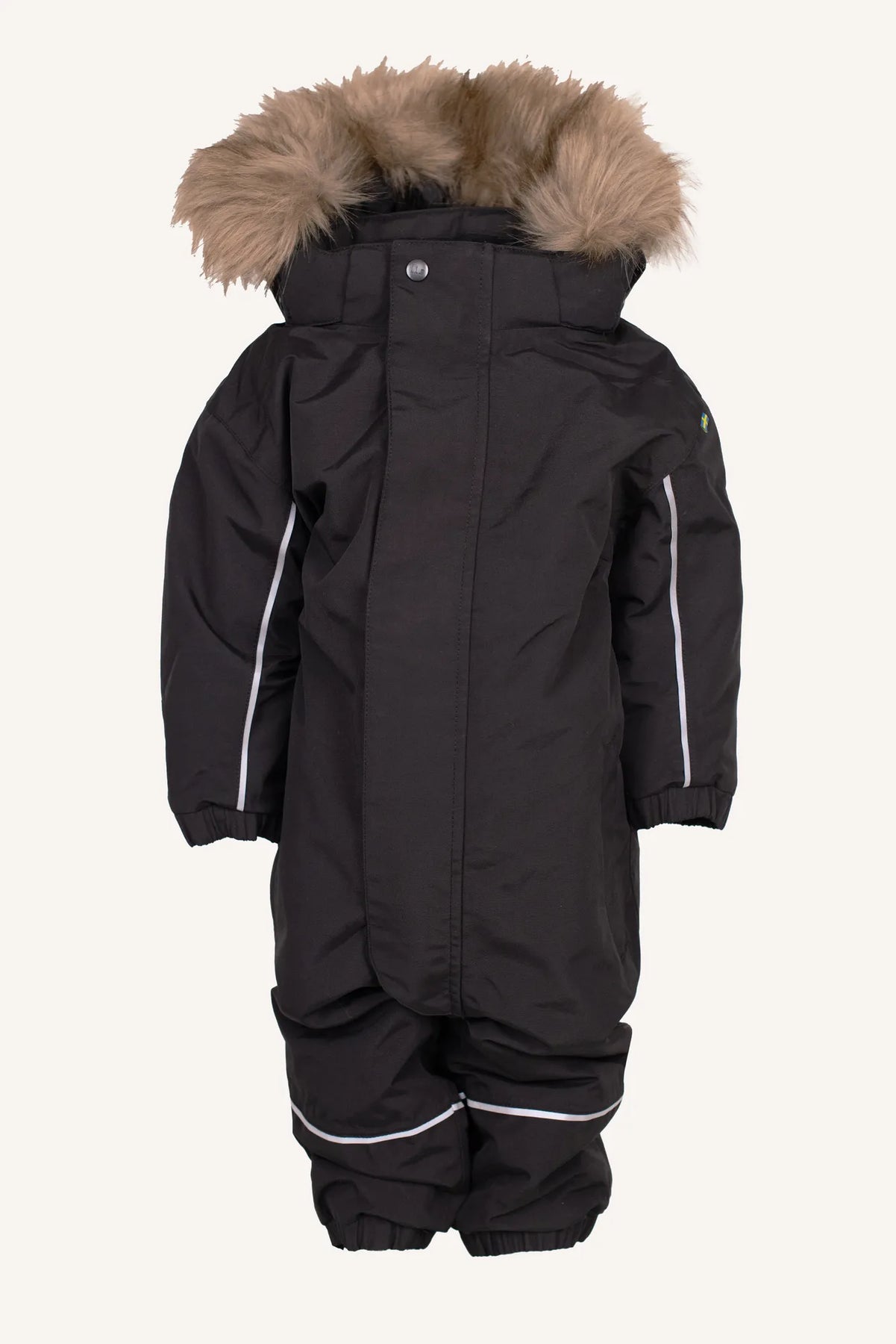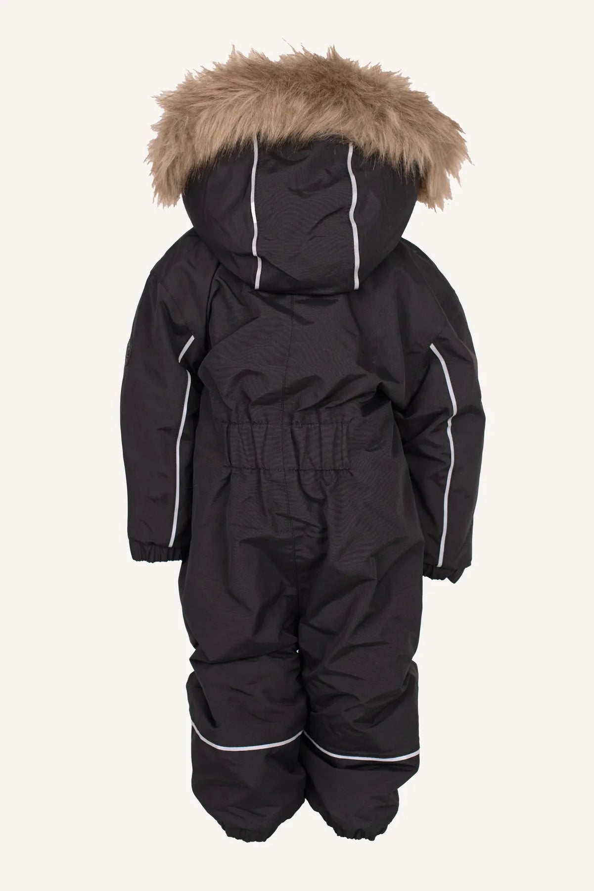 Nordic is a comfortable and flexible winter overall for the little ones with elastic bands around the sleeve and leg ends that keep it in place. It is fully windproof and waterproof, removable and adjustable foot straps that you place under the shoe to prevent the coverall from riding up during play, reflective details, two zipped pockets and a removable hood with synthetic fur (the fur is also removable). The coverall has a nylon lining that allows you to easily work with layers depending on the temperature.